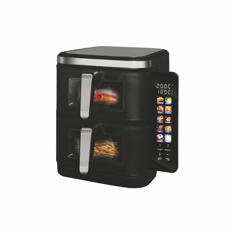 دارای دو مخزن 5.5لیتری روی هم هست که جمعا 11لیتر گنجایش مواد غذایی در دو طبقه دارد وقابلیت تنظیم دما در یکی از طبقاط به صورت مجزا.یکی از ویژگیهای این سرخ کن هوا پز قابلیت مچ سازی و تنظیم دما و زمان همزمان دستگاه میباشد.